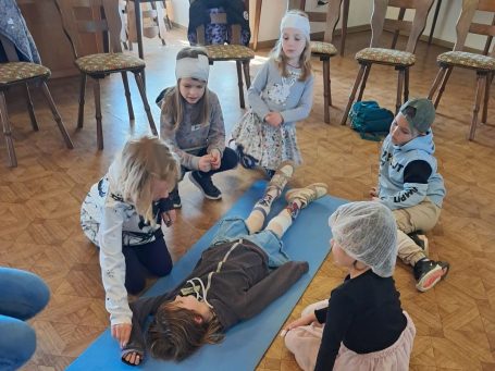 Gemeinsam mit Unterstützung von den Maltesern lernten die Kinder, unter anderem, verschiedenes Verbandsmaterial und die stabile Seitenlage kennen.